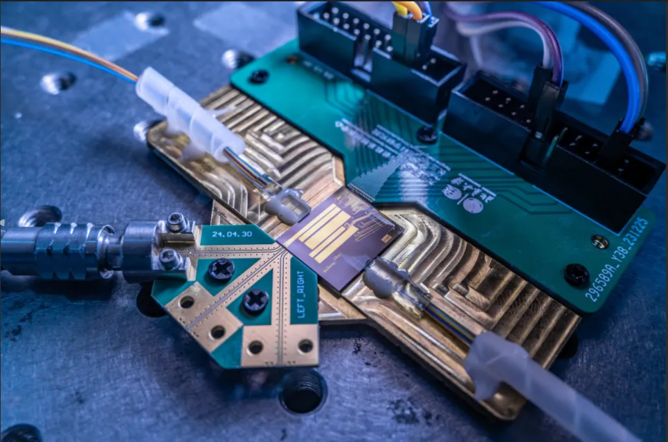 研究团队制备的超宽带光电融合芯片。北京大学供图