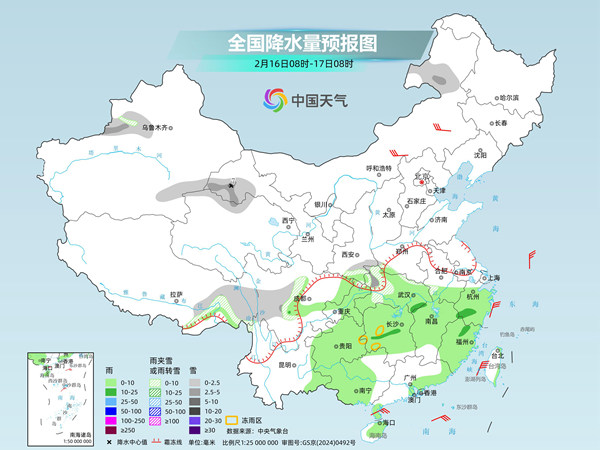16日(除夕),雨雪强度将有所减弱,西藏东部、川西高原中南部、内蒙古东北部、陕西南部、湖北北部和西部等地部分地区有小到中雪或雨夹雪,其中,甘肃河西局地有大雪;湖南西部、贵州东部等地局地有冻雨;西南地区东部、江汉南部、江南大部、华南西部和东南部、海南岛大部等地部分地区有小到中雨。