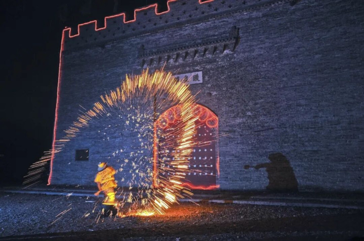 河北蔚县暖泉古镇的打树花表演,匠人将熔化的铁水泼向城墙 图/受访者提供